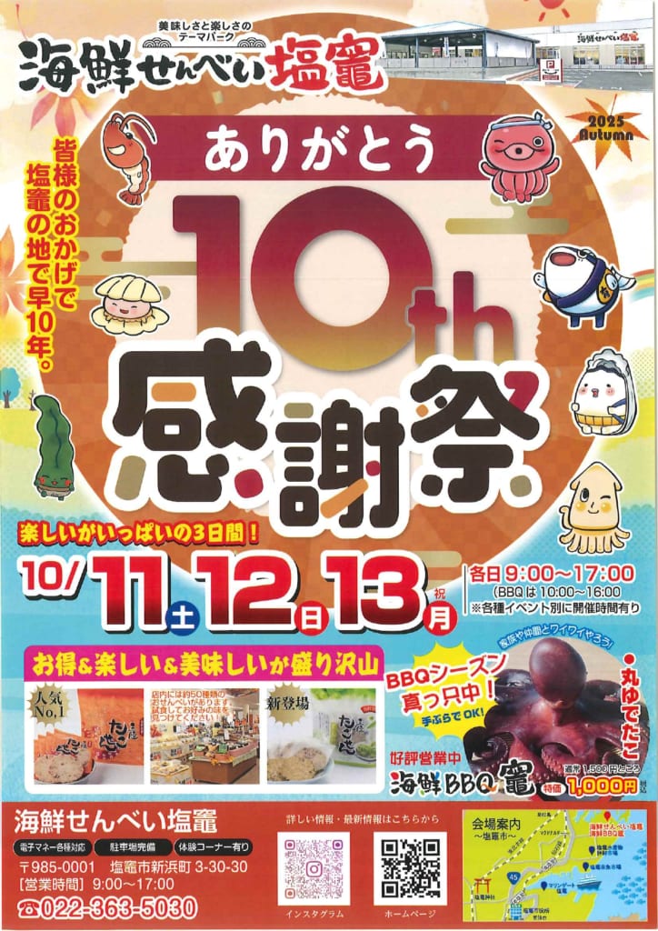 海鮮せんべい塩竃にご来場いただき、「#10周年ありがとう」と共に来場写真をSNSへ投稿することでもれなくプレゼントGET!