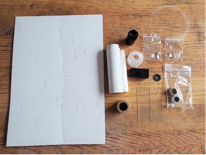 早速、キットを開けて中身を見てみると、細かい部品が多く、レンズやスライドグラスなどのガラスの部品も入っていました。