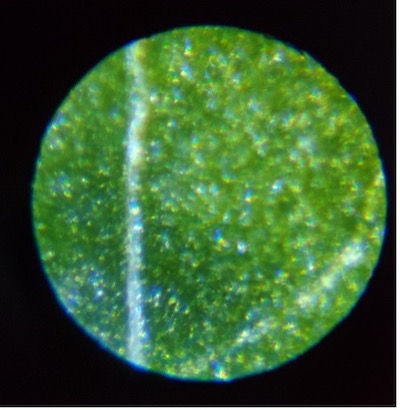さらに、モエちゃんは、冷蔵庫から持ってきた紫玉ねぎの皮とレタスをスライドグラスの上に乗せて「レタスがキレイ! 緑の結晶みたいだよ。玉ねぎの皮は黒い粒も見える。見た目とは全く違うね」と、驚いています。