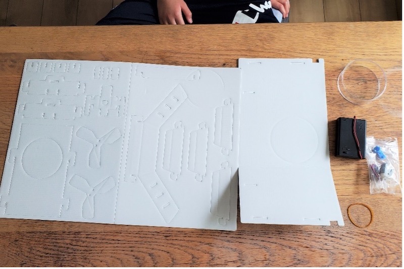 7歳のトラくんが挑戦したのは「ダンボールクーラー工作キット」です。水を入れて凍らせたペットボトルを置くと、涼しい風が出るというものです。