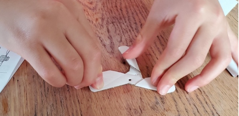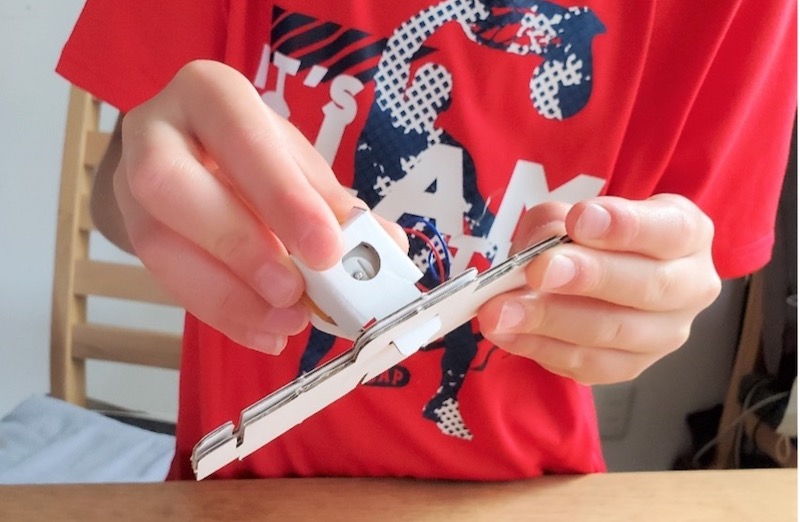 プロペラ部分もサッと折ってテープで止め、部品を使ってプロペラをモーターに固定します。