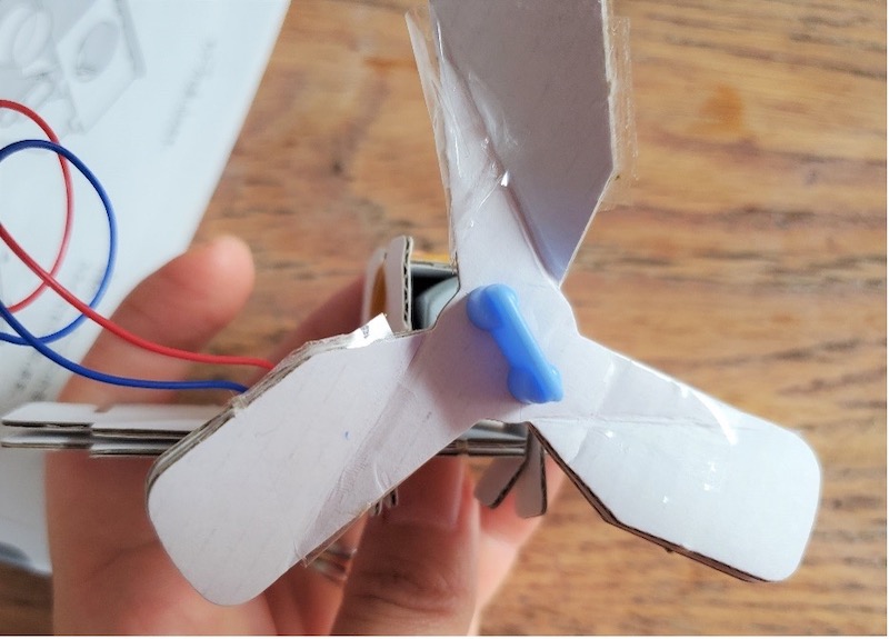導線をつなげたらスイッチを入れて、プロペラが回るのをチェックします。