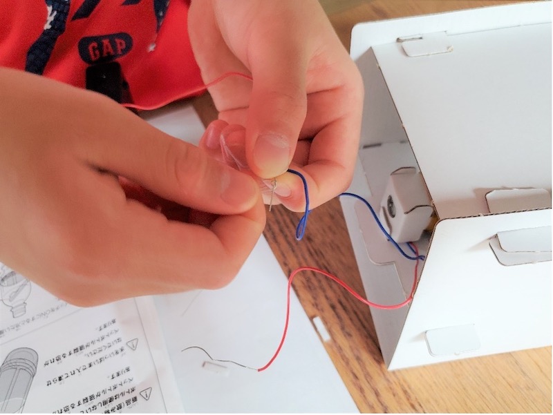 接続といっても、導線の針金部分をぐるぐる巻いて、針金部分にセロテープを止めるだけなのですが、「針金がうまく巻けない。難しい」と、トラくん。