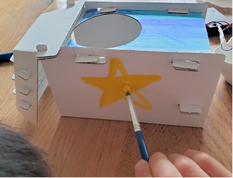 完成した「ダンボールクーラー工作キット」を、少しずつ分解しながら色塗りをするトラくん。「色塗りは、作る前にやってから組み立てたほうが良かったんじゃない?」と言いながら、迷わず青色ペンでサッと色を塗り、大好きな星を絵の具で描いていました。