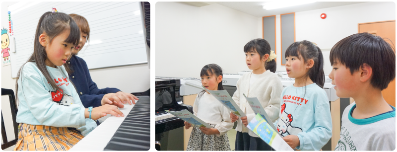 楽譜にも目を向けながら、多彩なジャンルの曲をドレミで歌います。メロディーやハーモニーをまねして歌うことで、音感を育てていきます。また、楽譜を見る習慣をつけることで、読譜力が身に付き、たくさんの曲が弾けるようになっていきます。