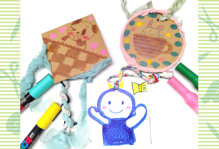 土台の台紙にペンでお絵かきしたり、ハギレを貼ったり結んだりして自分だけのオリジナルバッグチャームを作ろう!