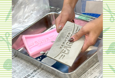 ワークショップ内では、宮城県内のスポーツチームのエンブレムや型枠にモルタルを流し入れ、レリーフも作成します。