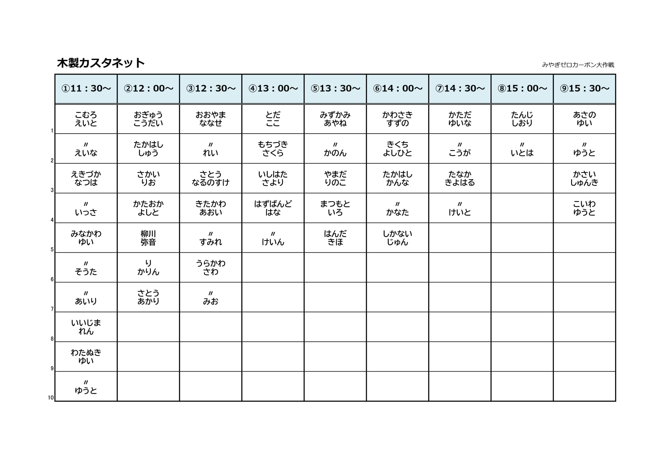 お子様の名前がどこにあるかご確認ください。名前の上に記載されている時間の回に参加いただけます。