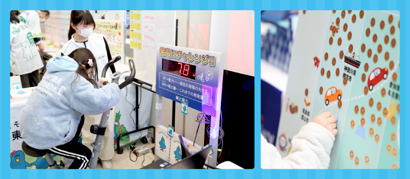 発電自転車をこいで何ワット作れるか挑戦!発電王を目指して思い切りこいでいました。楽しみながらエコなアクションについて学べる教育アプリの体験もしました。