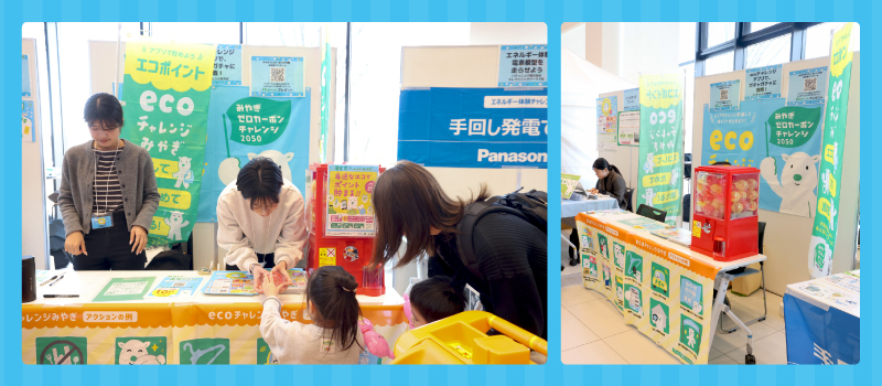 1/24(土)、イオンモール新利府南館にてみやぎゼロカーボンチャレンジ2050県民会議主催の環境イベントが開催されました。家族やお友達と楽しくエコについて考えようというイベントです。