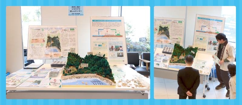 クイズを通して、グリーンカーボンや近年注目されている地球温暖化対策「ブルーカーボン」について学びました。ブースに展示された森林と海のジオラマに子供たちは興味津々でした。