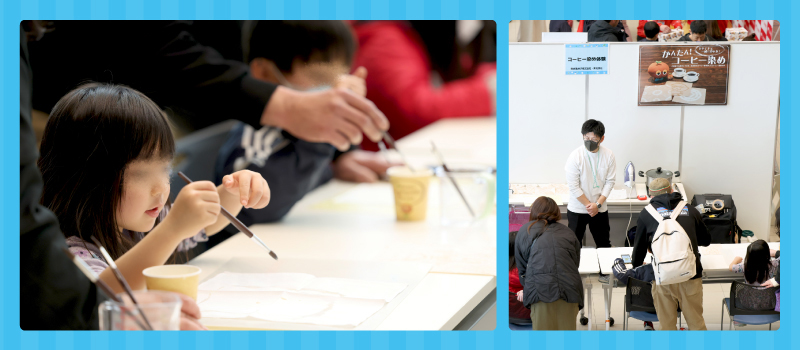 捨てられてしまうコーヒー粉を使ったコーヒー染めを体験。溶かした蝋でハンカチに絵を描いてオリジナルのハンカチに仕上げました。