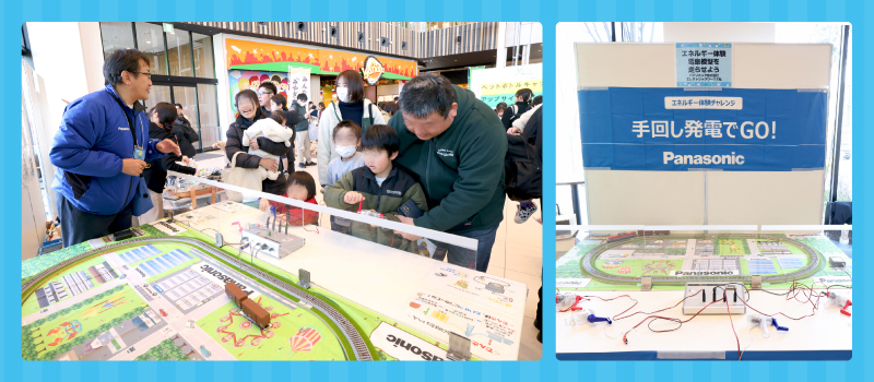 手回し発電機をぐるぐる回して電気を作る体験をしました。お友達や家族と協力して電車をどれだけ速く走らせられるかチャレンジしました。