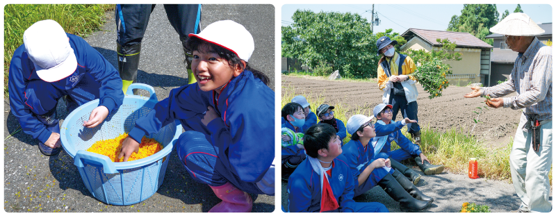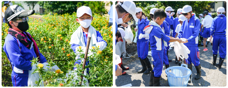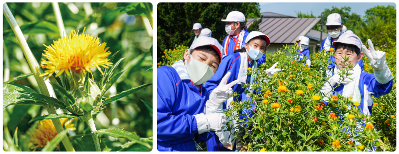 鮎貝小では2019年から地域貢献のために、収穫のお手伝いを始めました。日本農業遺産に認定された『最上紅花』という品種を6年生が7月に収穫しています。