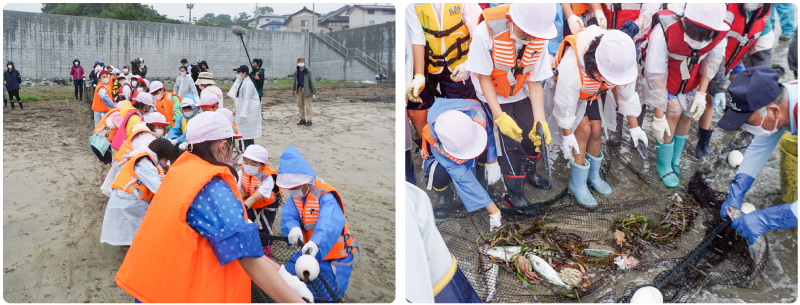 海岸清掃や砂を使った造形活動の他、海岸の防潮堤工事のために中止していた地引き網漁の体験学習も3年ぶりに行われました。