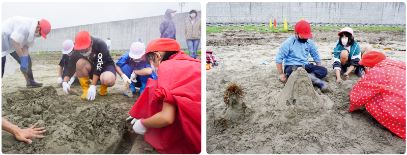 ウミガメやキャラクターなど、思い思いに好きな形を作っていきます。スコップを使って、砂を高く盛ったり、模様をつけたりして作品を仕上げました。