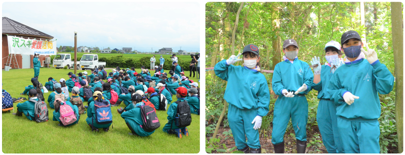 上青小では、地区のシンボルである沢スギを守っていくために「文化財愛護少年団」を結成し毎年2回、5年生と6年生が清掃・植樹を行います。