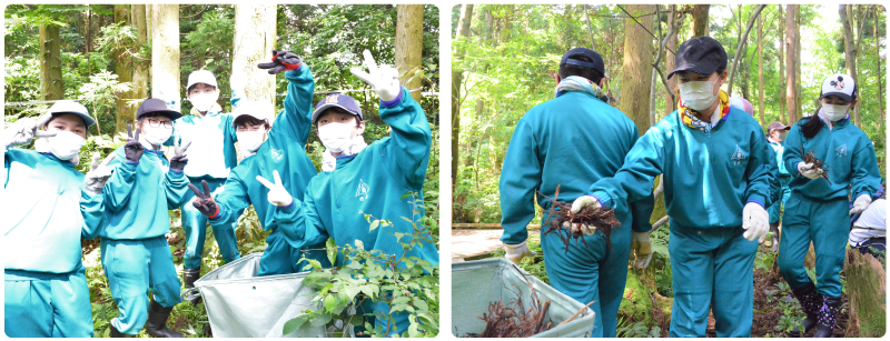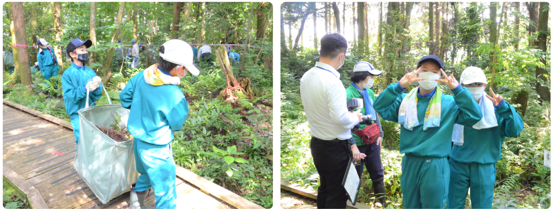 清掃活動では6つの班に分かれて木の枝や落ち葉拾いを協力して行います。