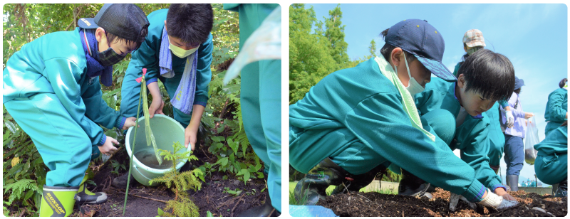 きれいにした後は学校で大切に育ててきた杉の苗木を植え、丁寧に土をかぶせて水をあげました。