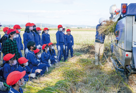 稲刈り後は、コンバインでの脱穀を見学し、米作りの学びを深めたようです。