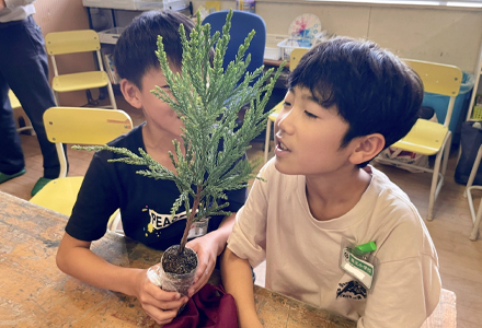 活動後には、教室の机や鉛筆など身近な物にも木が使われていることに気付き、「これも木で出来てる!」と周りの人に伝える姿が見られました。児童の一人は「ゲームで木は簡単に育つけど、本当の木は大きくなるのに時間がかかるんだね」と話し、学校の先生は「学校ではなかなかできない体験を通して、児童たちが自分の力や可能性を広げていく場になっています」と話していました。