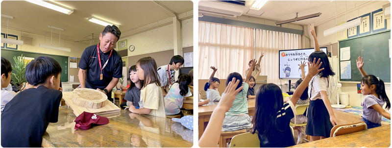 9月の教室では、株式会社山大の先生を招いて「木育」の授業が行われました。児童は、樹齢3年の苗木を見て「木の赤ちゃんだ!」と声を上げたり、樹齢50年の杉の木の年輪をじっくり観察して「色の濃さが違う!」と気付いたりと、木の成長について学びました。スギ・マツ・ヒノキの木材を使った「木の種類当てクイズ」では、重さや手触り、色や香りをヒントに答えを考える場面も。五感を使って「焼き芋の匂いがする」「杉の木って軽いんだね」など楽しそうに取り組んでいました。最後には「木から作られている物は何?」という質問が出され、紙やトイレットペーパーが木から作られていることも知った児童たち。
